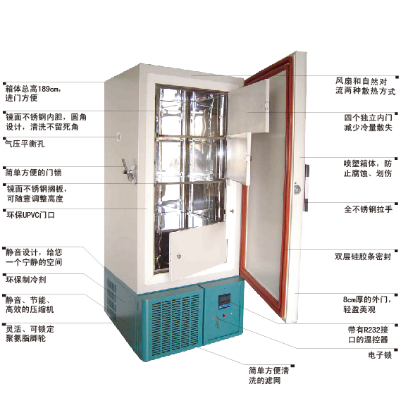 "天寒"-86℃超低溫冰箱采用德G進口復疊式超低溫制冷壓縮機組、G際知名品牌零部件生產,性能穩定,運行可靠。不銹鋼內膽、雙層保溫、外型美觀、噪音比進口品牌低、能耗比進口品牌少、經濟實用。通過采用風扇和自然對流兩種散熱方式,機器適應高溫及臟亂環境的能力大大加強,以較強的性價比優勢逐漸贏得了G內、G際市場的認可。產品被廣泛應用于生物制品、化學試劑、血漿、疫苗、菌種、生物樣本等低溫保存。